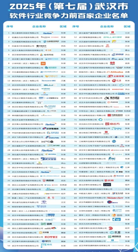 2025年(第七届)武汉市软件行业竞争力前百家企业来自全市11个区,其中,东湖高新区56家,江汉区10家,洪山区7家,经开区6家,武昌区5家,江岸和黄陂区各4家,东西湖区3家,青山和汉阳各2家,江夏区1家。